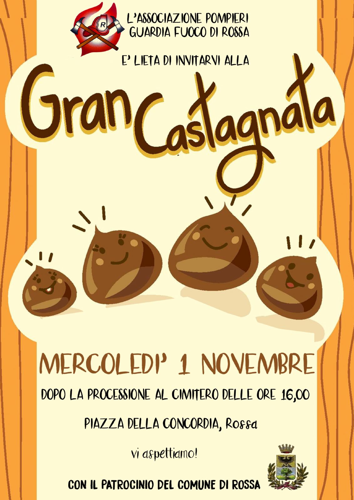 Anche quest'anno l'associazione Pompieri Guardia Fuoco di Rossa, con il patrocinio del Comune, vi invita alla tradizionale Castagnata in Piazza. Vi aspettiamo Mercoled' 1 Novembre, dopo la processione al cimitero delle ore 16,00.