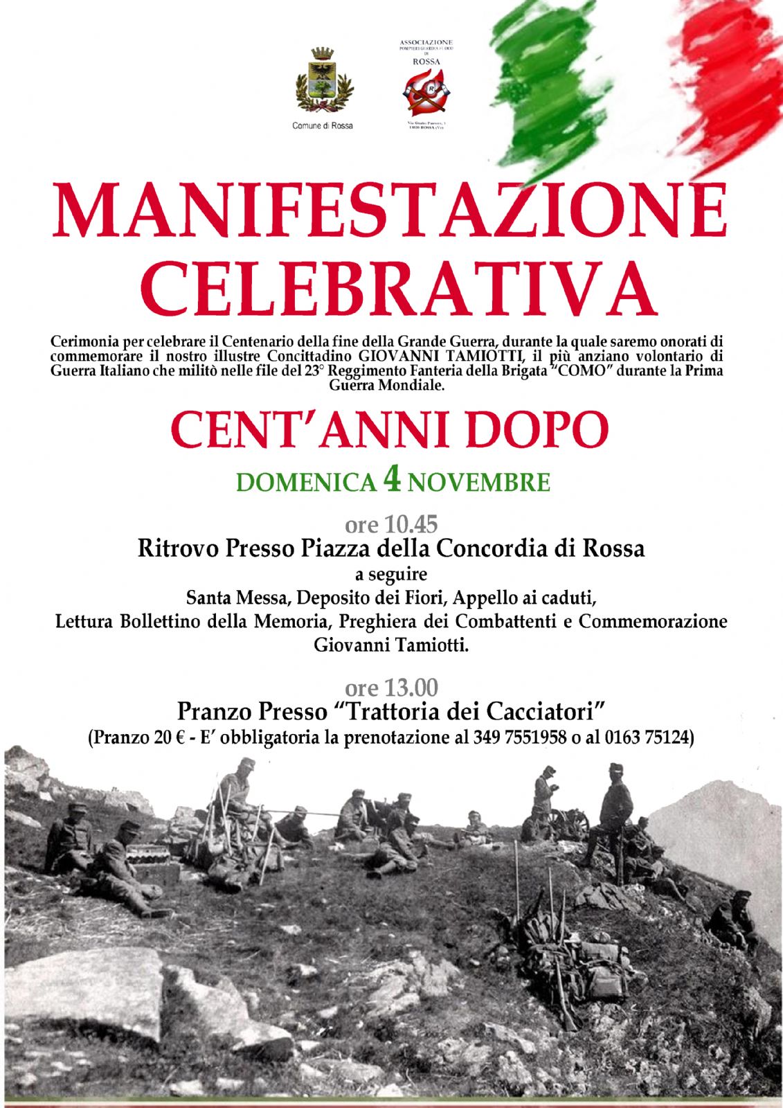 Domenica 4 Novembre si svolgerà presso il nostro Comune una grande Cerimonia per celebrare il Centenario della fine della Grande Guerra, durante la quale saremo onorati di commemorare il nostro illustre Concittadino Giovanni TAMIOTTI, il più anziano volontario di Guerra Italiano che militò nelle file del 23° Reggimento Fanteria della Brigata “COMO” durante la Prima Guerra Mondiale.